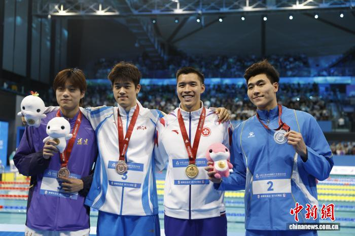 11月16日晚,在第十五届全运会男子50米自由泳决赛中,香港队何甄陶夺得冠军。图为获奖选手合影。 中新社记者 韩海丹 摄纪录频繁被打破,折射出中国游泳竞技水平提升与内部竞争加剧。但放眼世界,技术革新与训练升级正推动游泳潜能重塑,中国游泳正以新纪录为新起点,以在更高水平的国际舞台上直面挑战、追赶强手。