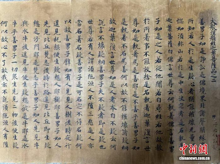中新网兰州12月15日电 (戴文昌)在甘肃省博物馆馆藏珍贵文物中,一件出土于敦煌莫高窟藏经洞的唐代经卷《大般涅槃经迦叶菩萨品之二》,以端正严谨的楷书书写,其精湛艺术水准,成为敦煌遗书精品。它不仅是解读唐代书法艺术与丝路文化交流的珍贵实物,也为世人打开一扇穿越千年的文化之窗。