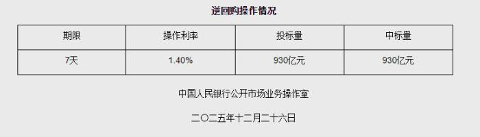中新网12月26日电 据央行网站消息,2025年12月26日中国人民银行以固定利率、数量招标方式开展了930亿元7天期逆回购操作。具体情况如下: