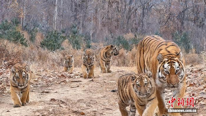 中新社长春12月26日电 (记者 郭佳)记者26日从东北虎豹国家公园管理局获悉,今年11月8日,在公园的珲春片区监测到一只雌性野生东北虎带领五只幼崽出现,这是中国首次拍到“六虎同框”影像。