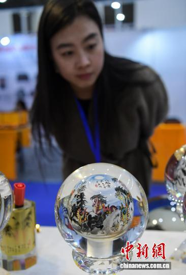 12月26日,观众在展会上观赏水晶内画“八骏图”。中新社记者 张勇 摄