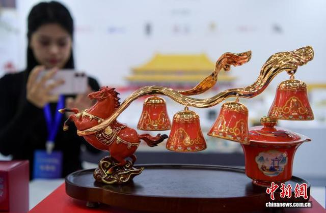 12月26日,观众在展会上观赏铜合金烧色工艺品“跃马鸣祥茶器”。中新社记者 张勇 摄