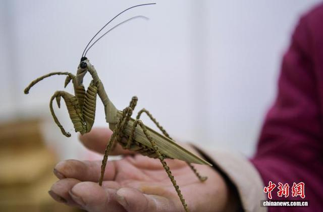 12月26日,手工艺人展示草编“螳螂”。中新社记者 张勇 摄