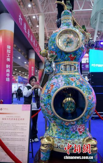 12月26日,观众在展会上观赏“福禄万代景泰蓝钟”。中新社记者 张勇 摄