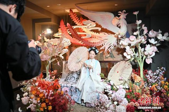 12月26日晚,游客在广州市海珠区的沉浸式岭南饮食文化体验餐厅体验古装拍摄。据介绍,该餐厅为消费者推出用餐前的古装换装、妆造等体验,宴席全程穿插粤剧、醒狮、武术、广绣等表演,让消费者沉浸式感受岭南文化。中新社记者 陈楚红 摄