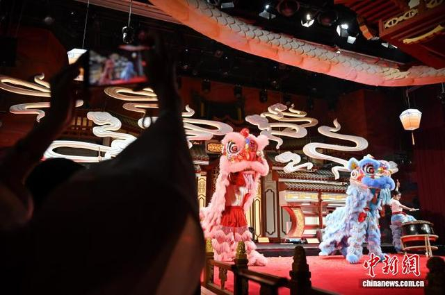 12月26日晚,广州市海珠区,沉浸式岭南饮食文化体验餐厅的醒狮表演吸引顾客拍照。据介绍,该餐厅为消费者推出用餐前的古装换装、妆造等体验,宴席全程穿插粤剧、醒狮、武术、广绣等表演,让消费者沉浸式感受岭南文化。中新社记者 陈楚红 摄