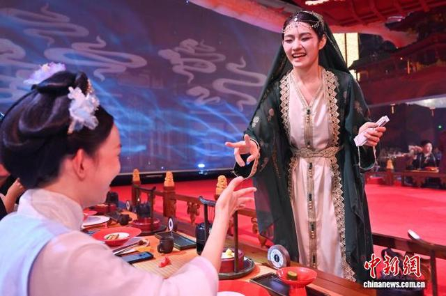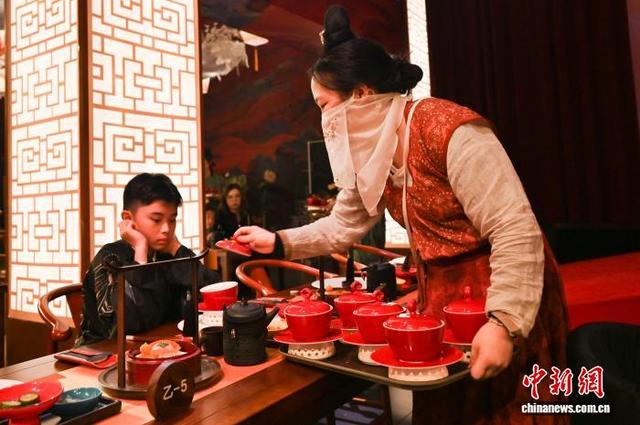 12月26日晚,在广州市海珠区的沉浸式岭南饮食文化体验餐厅,穿着古装的工作人员为顾客上菜。据介绍,该餐厅为消费者推出用餐前的古装换装、妆造等体验,宴席全程穿插粤剧、醒狮、武术、广绣等表演,让消费者沉浸式感受岭南文化。中新社记者 陈楚红 摄