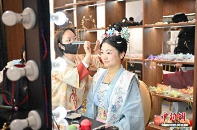 12月26日晚,游客在广州市海珠区的沉浸式岭南饮食文化体验餐厅体验古装妆造。据介绍,该餐厅为消费者推出用餐前的古装换装、妆造等体验,宴席全程穿插粤剧、醒狮、武术、广绣等表演,让消费者沉浸式感受岭南文化。中新社记者 陈楚红 摄