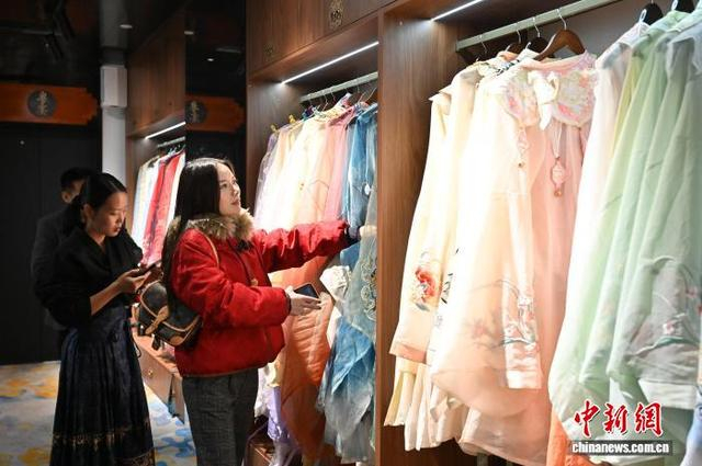 12月26日晚,游客在广州市海珠区的沉浸式岭南饮食文化体验餐厅挑选古装。据介绍,该餐厅为消费者推出用餐前的古装换装、妆造等体验,宴席全程穿插粤剧、醒狮、武术、广绣等表演,让消费者沉浸式感受岭南文化。中新社记者 陈楚红 摄