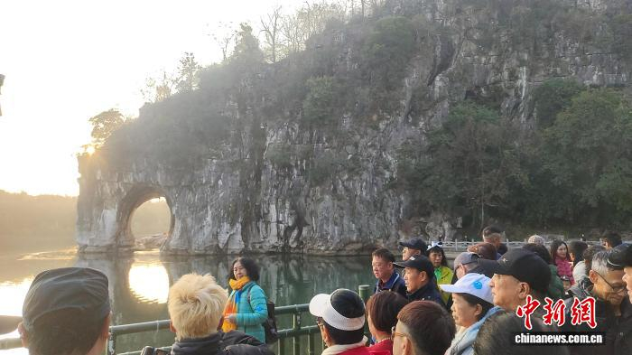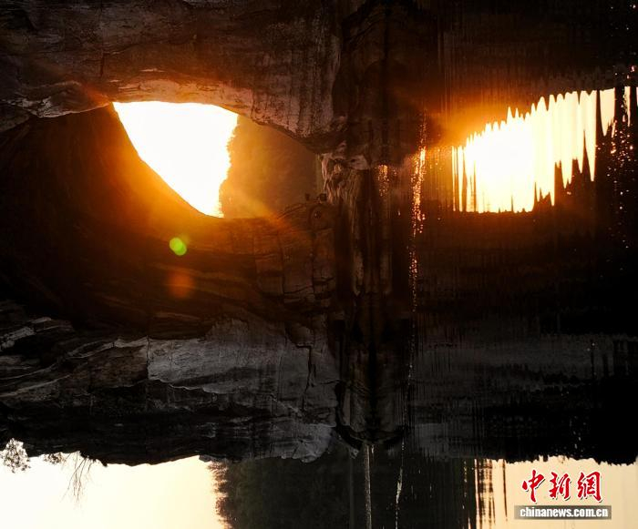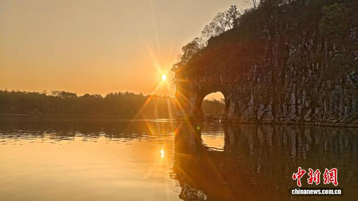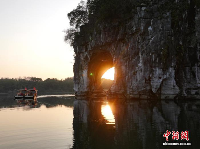 12月27日,清晨的阳光照进桂林城徽景观象山水月洞,水月洞倒映在漓江水面形成酷似“猫眼”奇观。杨宗盛 摄