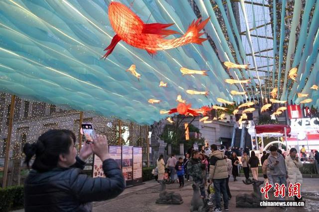 12月27日晚,游客在重庆长嘉汇购物公园观赏新年灯会。新年将至,重庆南岸区长嘉汇购物公园与弹子石老街打造新年灯会,十余组精美彩灯点亮街区,营造沉浸式灯光艺术体验,吸引不少市民游客前来“打卡”游玩。中新社记者 何蓬磊 摄