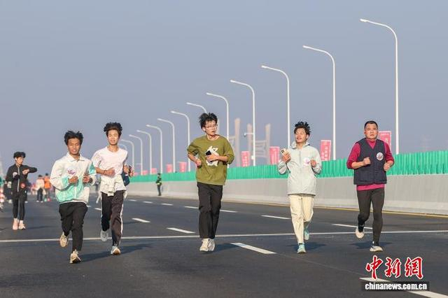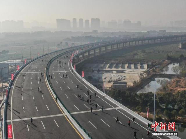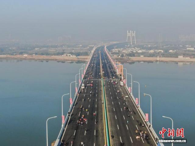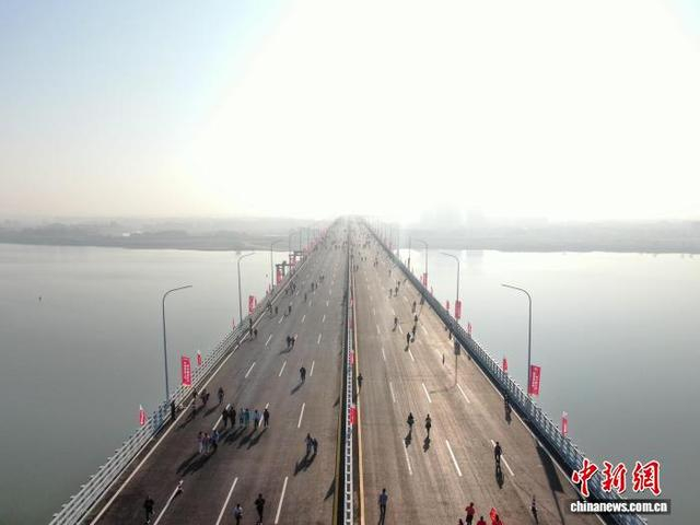 12月28日,江西南昌,跑步爱好者从隆兴大桥上跑过。当日,“爱我英雄城·乐跑隆兴桥”活动举行,4.3万余名跑步爱好者从即将通车的隆兴大桥两侧同时出发,以跑步跨桥的形式,感受城市发展新貌和运动的乐趣。隆兴大桥跨越赣江,是一座大跨度公铁合建桥梁,其中公路段线路全长约10.46公里,贯通南昌北部片区与赣江新区,预计于近期建成通车。中新社记者 刘力鑫 摄