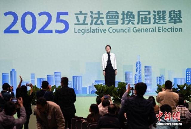 12月8日清晨,香港特区第八届立法会选举功能团体界别投票结果在位于香港会议展览中心的中央点票站新闻中心陆续公布。巴黎奥运会女子个人重剑金牌得主江旻憓在旅游界胜出,当选第八届立法会议员。图为宣布选举结果时,江旻憓登台亮相。 中新社记者 侯宇 摄