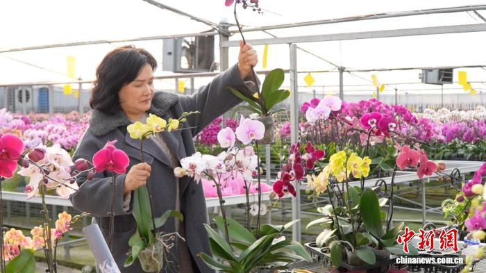 该花卉基地内,“大辣椒”“藏宝图”“光芒四射”等有着吉祥花名的品种销售火热,承载着人们对新年的期许。相较于单株蝴蝶兰,消费者更青睐组盆后的丰满花束。
