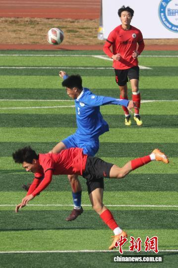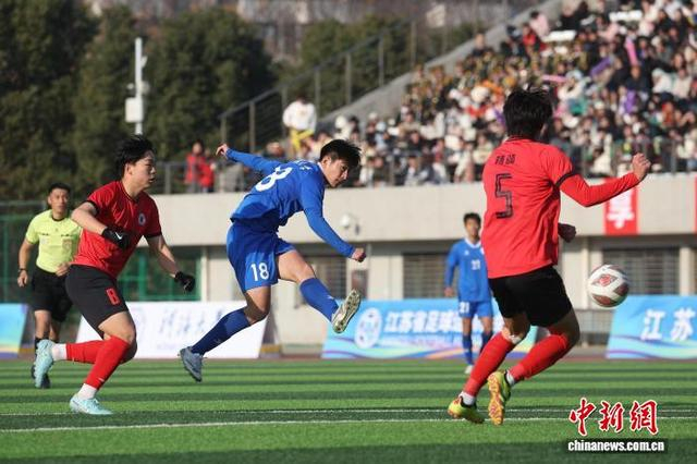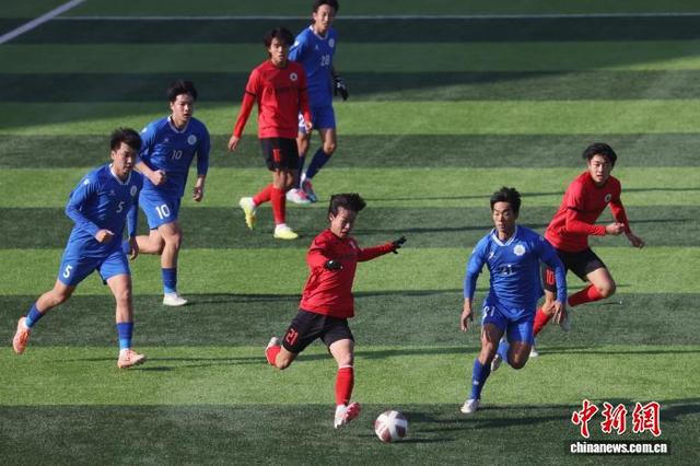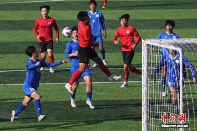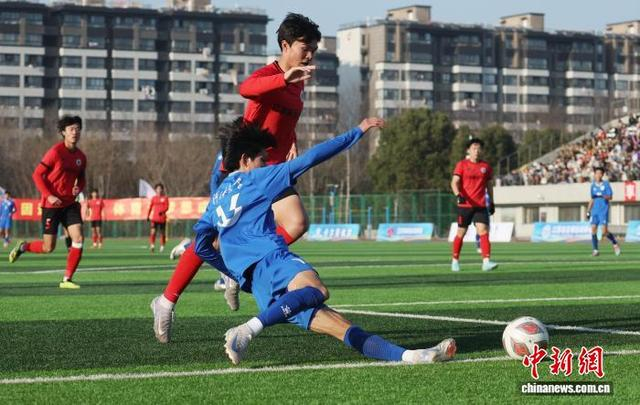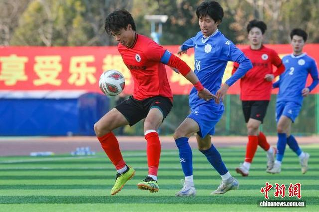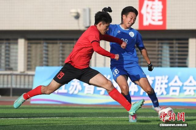 12月28日,2025年江苏省“省长杯”大学生足球联赛(高水平男子组)决赛在南京邮电大学仙林校区举行,最终,江苏师范大学队战胜河海大学队,获得冠军。据悉,2025年江苏省“省长杯”大学生足球联赛设高水平男子、女子组,普通本科男子、女子组,高职高专男子、女子组,吸引了来自全省84所高校的108支队伍、2812名运动员参加,赛事规模达历年之最。图为江苏师范大学队球员(红衣)与河海大学队球员(蓝衣)在比赛中比拼。中新社记者 泱波 摄