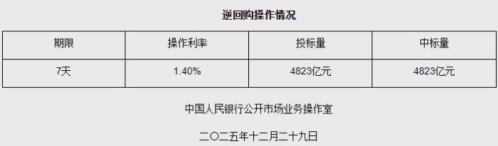 中新网12月29日电 据央行网站消息,2025年12月29日中国人民银行以固定利率、数量招标方式开展了4823亿元7天期逆回购操作。具体情况如下: