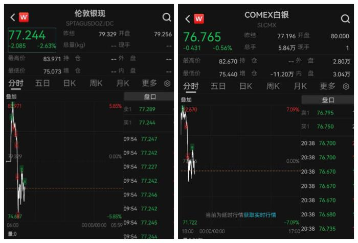 数据来源:Wind具体来看,伦敦白银现货一度涨超5%,但随后转跌,跌幅一度超5%;COMEX白银期货一度涨超7%,随后同样转跌。黄金期货、现货均由涨转跌。