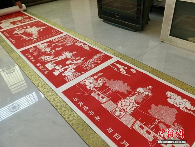 在他的作品中,生肖贺岁、喜庆民俗等题材应有尽有,一张张红纸在剪刀的游走间,化作承载着吉祥寓意的艺术品。2023年,为了创作32米长卷《上党神话》,他曾耗时半年考察采风、收集资料,再用两年时间精心剪刻,将女娲补天等故事浓缩于红纸之上,让家乡文化通过指尖艺术得以传承。