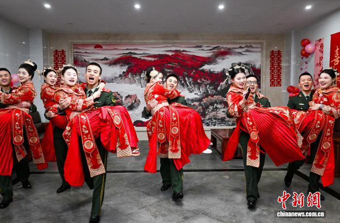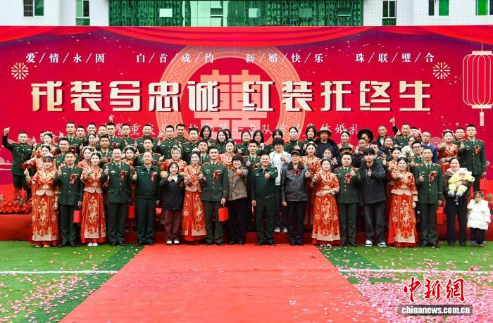 情定橄榄绿,共赴强军梦。近日,武警重庆总队执勤第一支队举行“戎装写忠诚·红装托终生”首届集体婚礼,16对新人在战友的祝福与欢呼中许下誓言。戎装在身、使命在肩,执手相望、共赴一生,他们以爱为翼、以责任为盾,一个守护家国安宁,一个守护家庭温暖,让“守国”与“守家”的双向奔赴,成为冬日军营里最动人的风景。图为接亲现场。郭传伍 摄