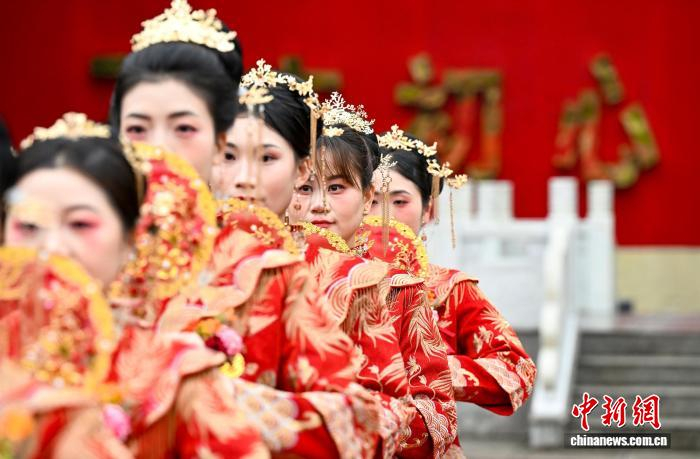 图为婚礼现场,新娘们用团扇遮面。郭传伍 摄