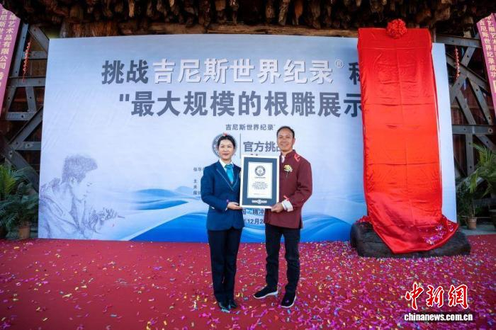 中新网昆明12月29日电 (陈静)29日,挑战吉尼斯世界纪录称号“最大规模的根雕展示”认证仪式在云南省腾冲市举行。经吉尼斯世界纪录官方的严格审核以及现场认证确认,由腾冲根雕艺人陈兴独立雕刻的3666件根雕作品,成功创下“最大规模的根雕展示”吉尼斯世界纪录。
