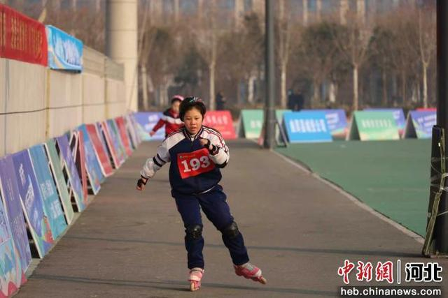 图为小学女子组速度滑轮比赛。 贾韶辉 摄据介绍,本次运动会设置速度轮滑、陆地冰壶两大项目,吸引30支中小学代表队和6支陆地冰壶社会组代表队参加比赛。(完)