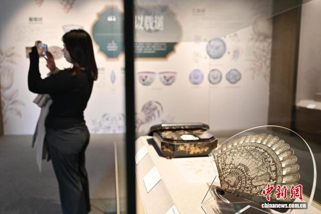 图为展览展出19世纪的黑漆描银人物故事纹折扇。中新社记者 陈楚红 摄