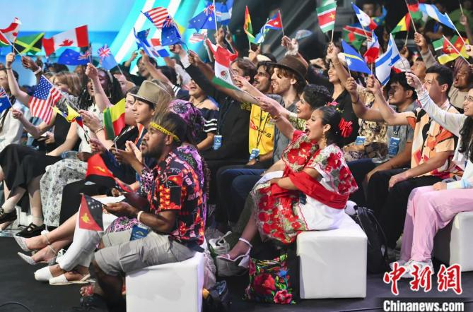 2025年8月24日,第二十四届“汉语桥”世界大学生中文比赛全球总决赛在福建平潭举行。图为参赛选手为参加最后总决赛的选手加油。 中新社记者 王东明 摄