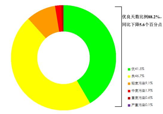 11月,全国339个地级及以上城市平均空气质量优良天数比例为88.2%,同比下降5.6个百分点;平均重度及以上污染天数比例为0.7%,同比上升0.4个百分点。由沙尘天气导致的平均超标天数比例为5.3%,其中重度及以上污染天数比例为0.3%。
