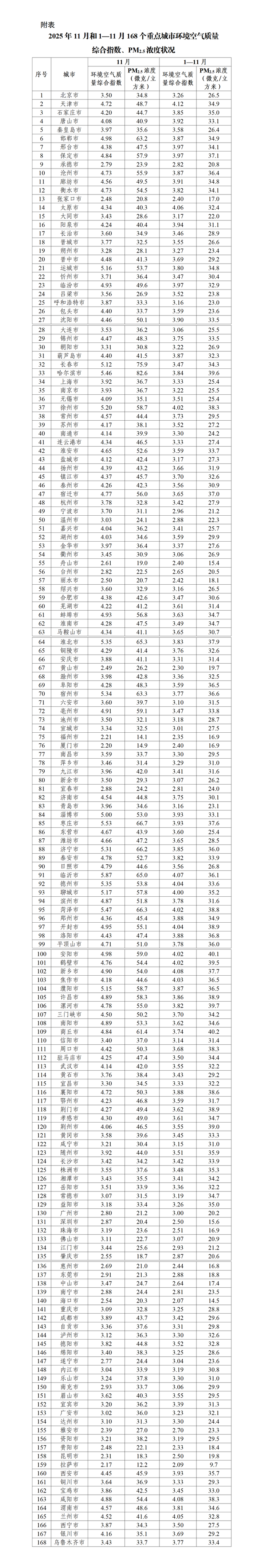 11月和1—11月168个重点城市环境空气质量综合指数、PM2.5浓度状况详见附表。