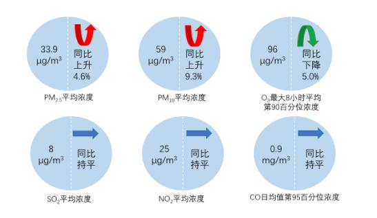 11月,全国339个地级及以上城市PM2.5平均浓度为33.9微克/立方米,同比上升4.6%;PM10平均浓度为59微克/立方米,同比上升9.3%;O3平均浓度为96微克/立方米,同比下降5.0%;SO2平均浓度为8微克/立方米,同比持平;NO2平均浓度为25微克/立方米,同比持平;CO平均浓度为0.9毫克/立方米,同比持平。