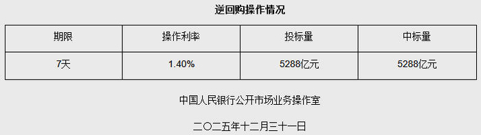 中新网12月31日电 据央行网站消息,2025年12月31日中国人民银行以固定利率、数量招标方式开展了5288亿元7天期逆回购操作。具体情况如下: