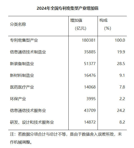 从内部构成看,新装备制造业规模最大,增加值为51377亿元,占专利密集型产业增加值的比重为28.5%;其次是信息通信技术服务业,增加值为43709亿元,所占比重为24.2%;再次是信息通信技术制造业,增加值为35885亿元,所占比重为19.9%。