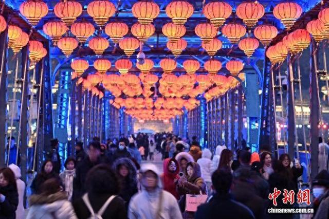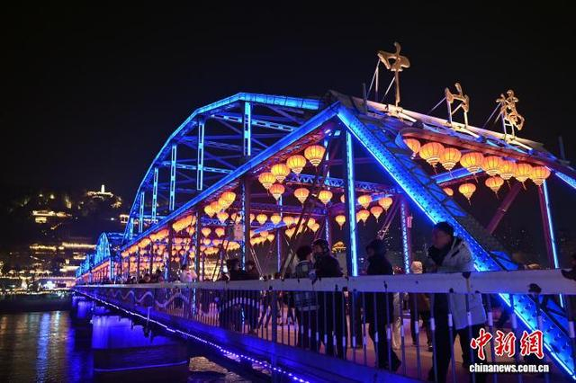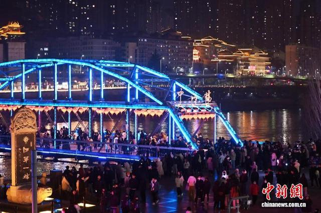 12月31日晚,甘肃兰州,民众在中山铁桥上拍照打卡。中新社记者 九美旦增 摄