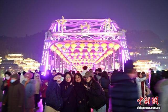 12月31日晚,甘肃兰州,民众在中山铁桥上拍照打卡。元旦前夕,不少市民、游客来到当地标志性建筑中山桥上,迎接2026新年的到来。中新社记者 九美旦增 摄