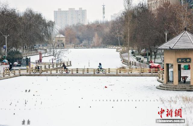 12月31日,干旱少雨的新疆和田市迎来降雪,道路、树木、建筑物被积雪覆盖,吸引民众享受雪后乐趣。许晓龙 摄