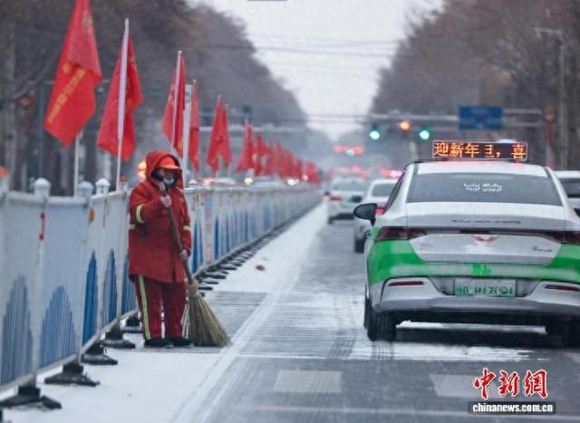 12月31日,干旱少雨的新疆和田市迎来降雪,道路、树木、建筑物被积雪覆盖,吸引民众享受雪后乐趣。图为环卫工人清扫积雪。许晓龙 摄