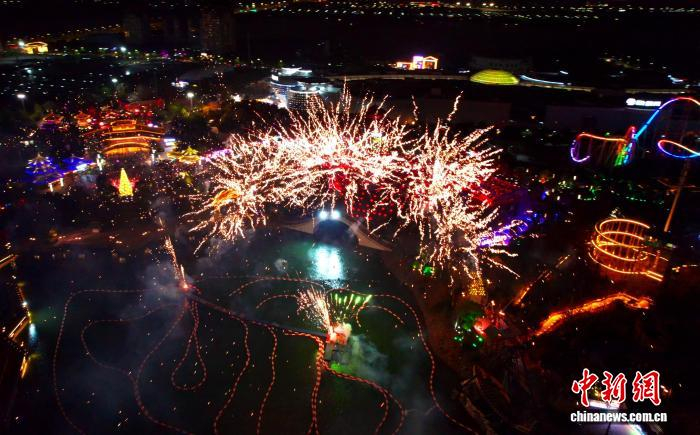 南昌融创乐园上演的跨年烟花秀。 江仲俊 摄南昌秋水广场喷泉随音乐同步开启,双子塔上映射出新年祝福,“南昌之星”摩天轮启动彩片装置,整个城市洋溢在欢乐的新年气氛里。(完)