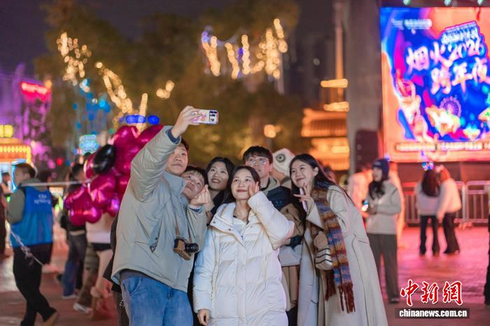 南昌融创乐园跨年夜活动现场“打卡拍照”的市民。 江仲俊 摄光幕之下,南昌多场跨年音乐会全程高能,从经典旋律到现代潮流,从民族风情到国际盛典,汇聚了各种风格的音乐节目。不同年龄、不同地域的人们汇聚在一起,在音乐的海洋中尽情摇摆,用歌声和欢呼声迎接新年。