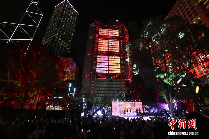 2025年12月31日晚,香港特区行政长官李家超等主持香港跨年倒数活动,与现场人士一起迎接2026年。跨年倒数活动上,香港中环8座大厦的外墙展示巨型倒数时钟,并展示以“新希望·新开始”为主题的光影图案,向本地及全球观众送上祝福。图为2026年1月1日,汇丰总行大厦外墙展示2026年的图案。中新社记者 李志华 摄