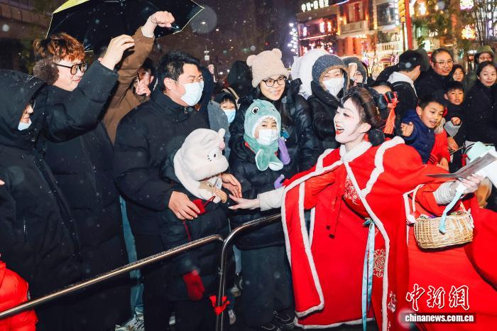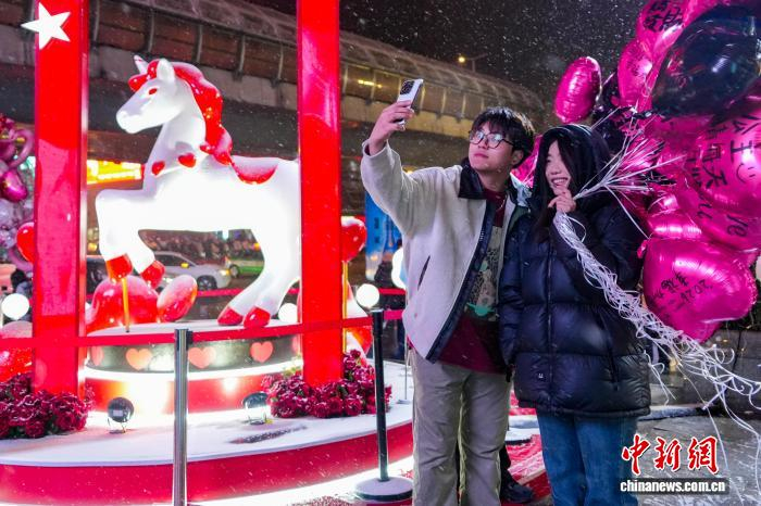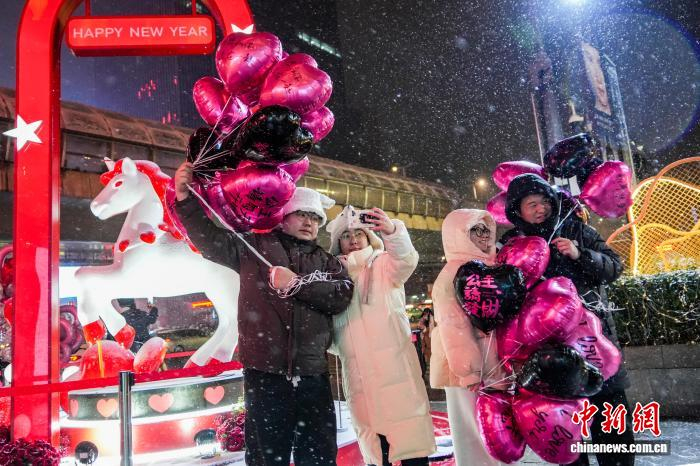2025年12月31日晚,河南郑州花园路商圈新年氛围浓,小雪中市民拍照留念,共同迎接2026年的到来。 中新社记者 范晓恒 摄