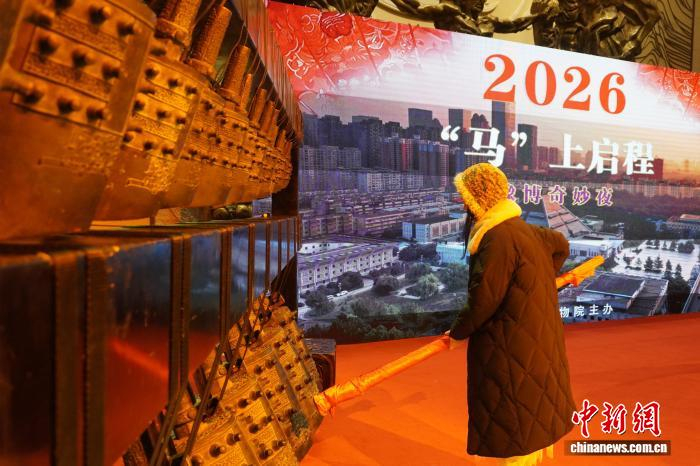 2025年12月31日晚间,河南郑州千名观众汇聚在河南博物院,参加“‘马’上启程·豫博奇妙夜”活动,共度文化感、仪式感十足的跨年夜。图为观众撞击编钟祈福。中新社记者 韩章云 摄