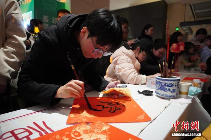 2025年12月31日晚间,河南郑州千名观众汇聚在河南博物院,参加“‘马’上启程·豫博奇妙夜”活动,共度文化感、仪式感十足的跨年夜。图为观众写“福”字。中新社记者 韩章云 摄