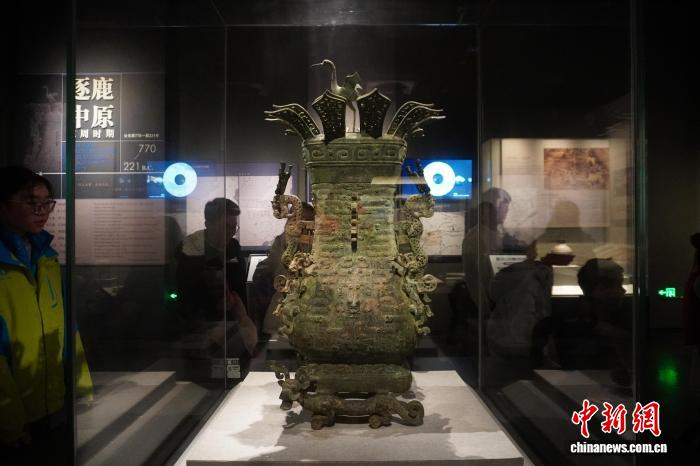 2025年12月31日晚间,河南郑州千名观众汇聚在河南博物院,参加“‘马’上启程·豫博奇妙夜”活动,共度文化感、仪式感十足的跨年夜。图为观众观看青铜器莲鹤方壶。中新社记者 韩章云 摄