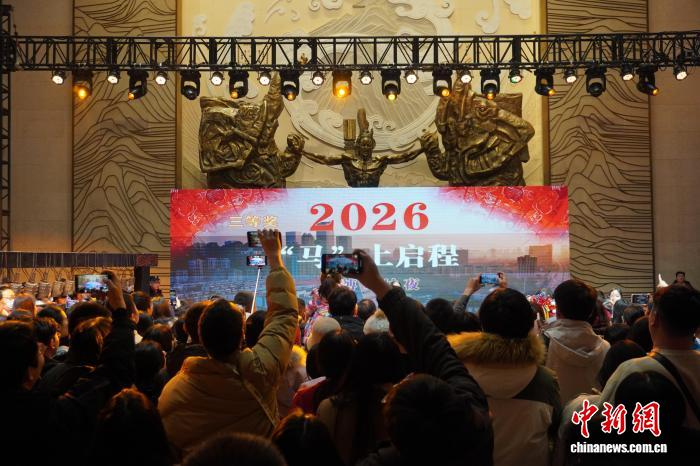 2025年12月31日晚间,河南郑州千名观众汇聚在河南博物院,参加“‘马’上启程·豫博奇妙夜”活动,共度文化感、仪式感十足的跨年夜。图为观众热情参与互动节目。中新社记者 韩章云 摄