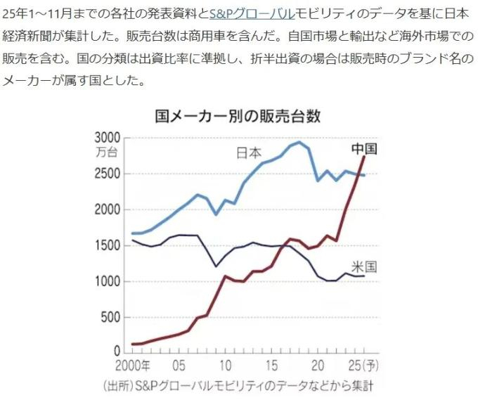 图片来源:《日本经济新闻》报道截图文章指出,过去,全球汽车市场曾是日美两国争夺销量首位的时代,日本车企在2018年达到销量顶峰,当年销量接近3000万辆。