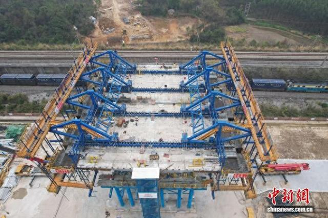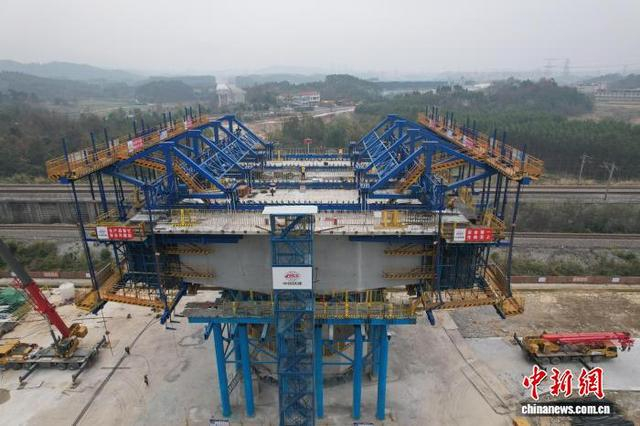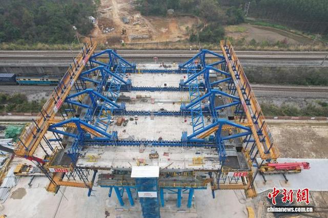 2026年元旦假期,广西桂林外环高速公路关键工程——五福特大桥2号桥施工现场依然繁忙。五福特大桥2号桥50余名建设者抢抓施工“黄金季”,全力推进工程建设。五福特大桥2号桥以32.2米的超宽桥面,刷新广西同类型转体桥梁的宽度纪录。其重达2.5万吨的梁体未来将精准转体,跨越下方繁忙的湘桂铁路、衡柳高铁,施工误差需控制在毫米级。建设者们坚守一线,运用多项创新工艺攻坚克难,为这条促进桂林旅游与区域互联的交通动脉全力冲刺。五福特大桥2号桥由中铁十一局承建,预计2026年8月底转体,2026年年底通车。图为航拍正在施工的五福特大桥2号桥。中新网记者 蒋雪林 摄