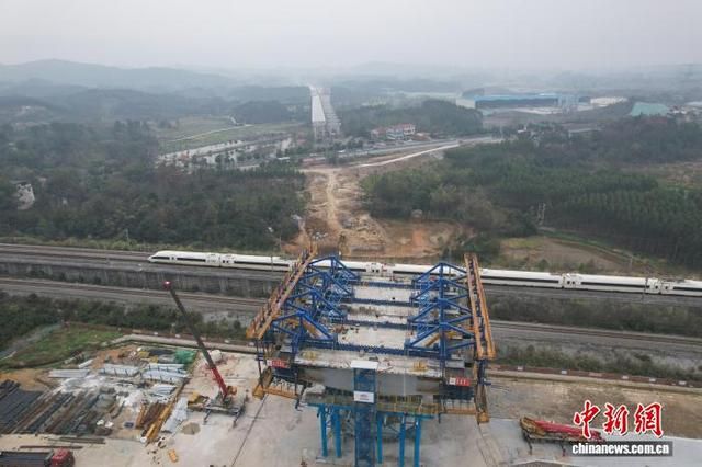图为航拍正在施工的五福特大桥2号桥,该桥将跨越湘桂铁路、衡柳高铁。中新网记者 蒋雪林 摄