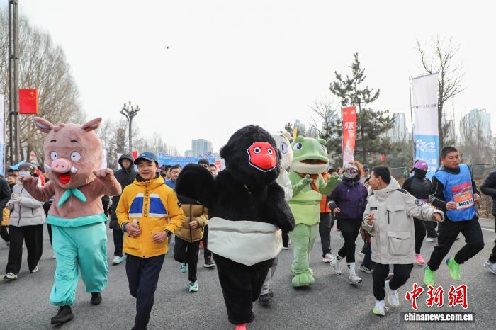 1月1日,青海西宁,跑者身穿电影《浪浪山小妖怪》角色服饰跑步。当日,2026年西宁地区第五十三届元旦环城赛鸣枪开跑,8000名运动爱好者赛跑迎接新年第一天。中新社记者 马铭言 摄