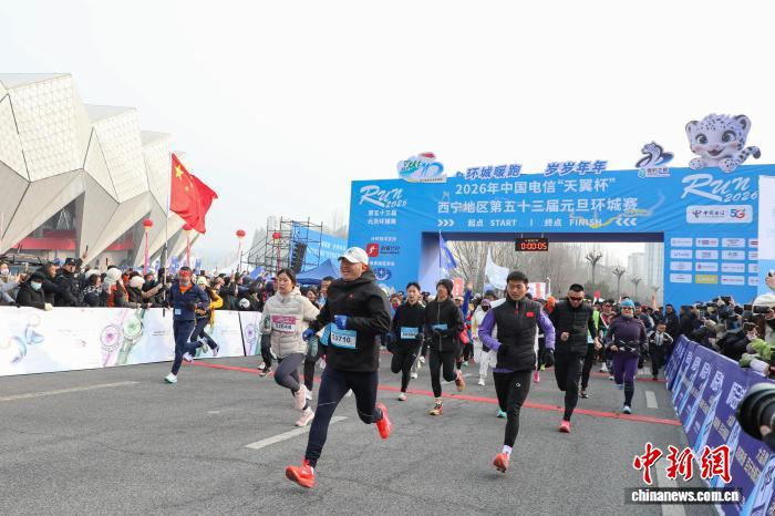 1月1日,青海西宁,跑者从起点出发。当日,2026年西宁地区第五十三届元旦环城赛鸣枪开跑,8000名运动爱好者赛跑迎接新年第一天。中新社记者 马铭言 摄